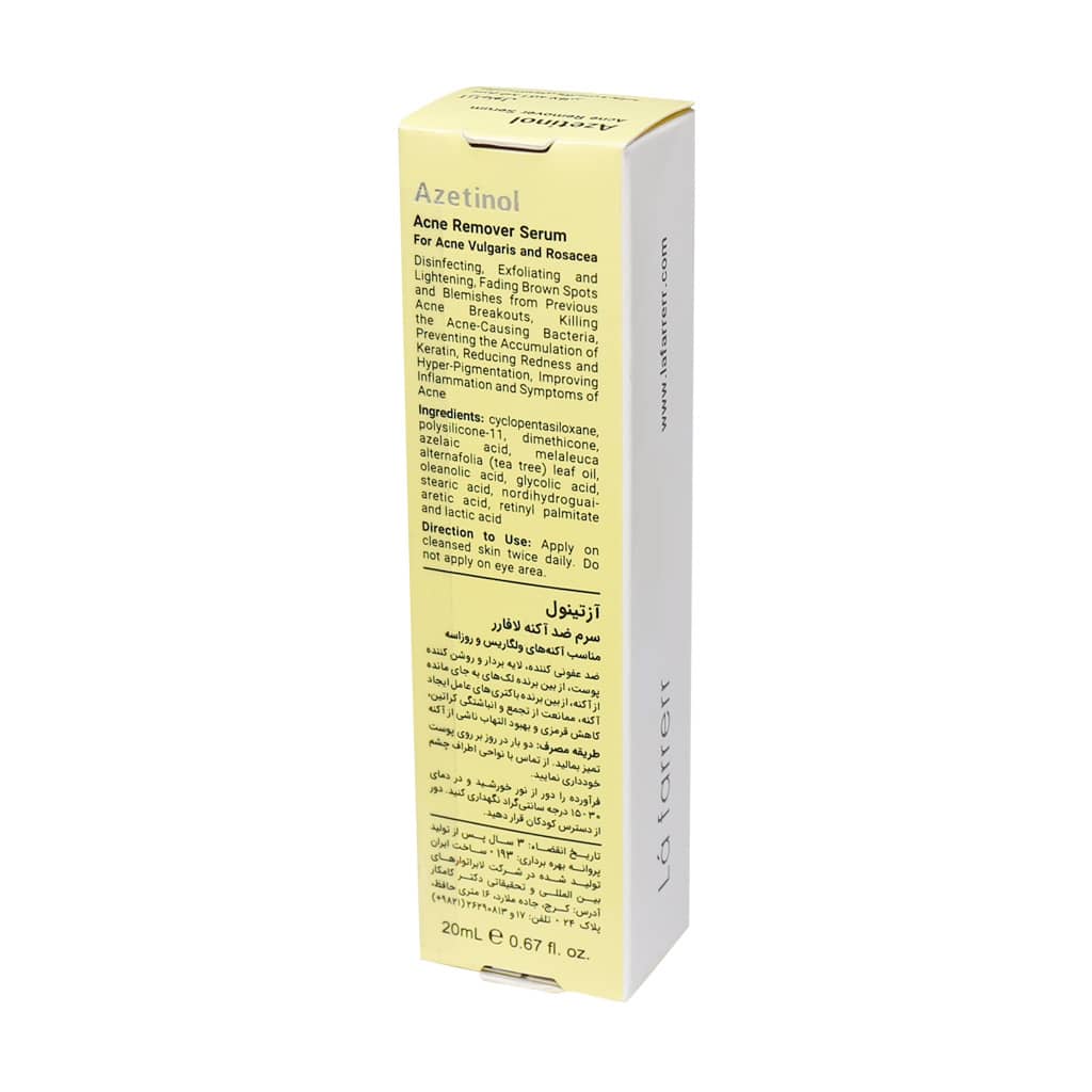 سرم ضد آکنه آزتینول لافارر محصولی فوقالعاده با کیفیت بوده و خاصیت ترمیم کنندگی و روشن کنندگی دارد. این محصول دارای مواد موثری برای رفع آکنههای خفیف تا متوسط ولگاریس و نیز بهبود آکنه روزانه است. این محصول حاوی مواد آزلائیک اسید، ویتامین آ، عصاره چای سبز و ترکیبات ارگانیک است که جذب سریعی در پوست دارند و علاوه بر آکنه و جوش تغییر رنگ ناشی از آثار به جای مانده از آن را برطرف میکنند. این سرم حساسیت و خشکی در پوست ایجاد نمیکند و به واسطه داشتن روغن درخت چای یک ضد عفونی کننده طبیعی محسوب میشود. سرم ضد آکنه دارای ویژگی ضد قارچ، ضد التهاب و ضد باکتری بوده و به حذف سلولهای مرده پوست کمک میکند. ویتامین A به کار رفته در این محصول عملکرد لایه برداری، نرمال سازی کراتینیزاسیون فولیکول و کاهش پوسته ریزی را سبب میشود. از دیگر آثار این سرم پوست میتوان به جلوگیری از انسداد منافذ پوستی و تشکیل آکنه اشاره نمود. این سرم میتواند با روشن کردن لکههای پوستی، تعادل را در رنگ پوست شما ایجاد کند و برای پایه آرایش نیز موثر است.