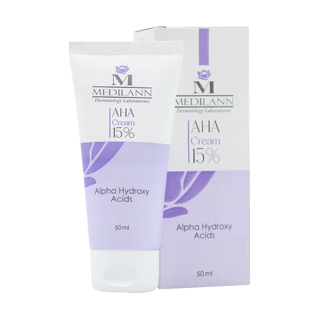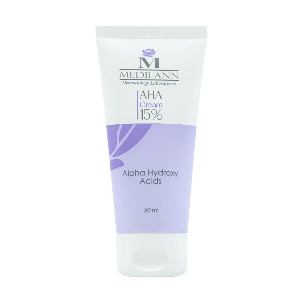 کرم لایه بردار AHA 15 درصد مدیلن حاوی آلفا هیدروکسی اسید است. این ماده به صورت کمپلکسی از چندین میوه ساختار پوست را ظریف و روشن کرده و فرآیند لایه برداری از اپیدرم، جوانسازی پوست، تحریک تولید سلولهای جدید، روشن سازی، افزایش رطوبت پوست را به دنبال دارد. آلفا هیدروکسی اسید گروهی از اسیدهای به دست آمده از گیاهانی همچون پرتقال (اسید آسکوربیک)، لیمو (اسید سیتریک)، نیشکر (اسید گلیکولیک)، انگور (اسید تارتاریک) و سیب (اسید مالیک) است که بر اساس تحقیقات انجام شده سبب افزایش پوسته ریزی طبیعی پوست و در نتیجه جداسازی لایه خارجی پوست میشود. از جمله مزایای دیگر این محصول میتوان به افزایش کلاژن سازی و کاهش چروکهای پوستی آن اشاره نمود.
